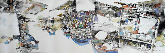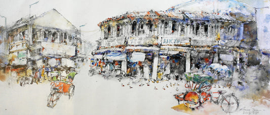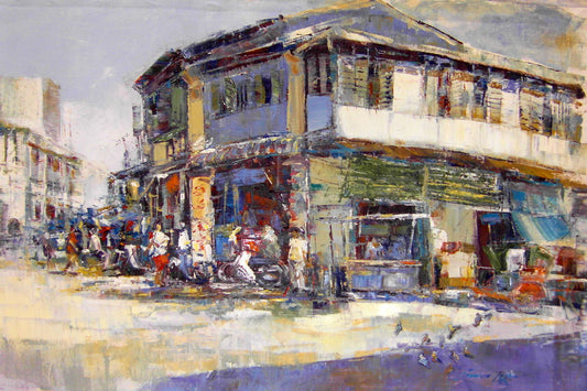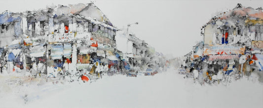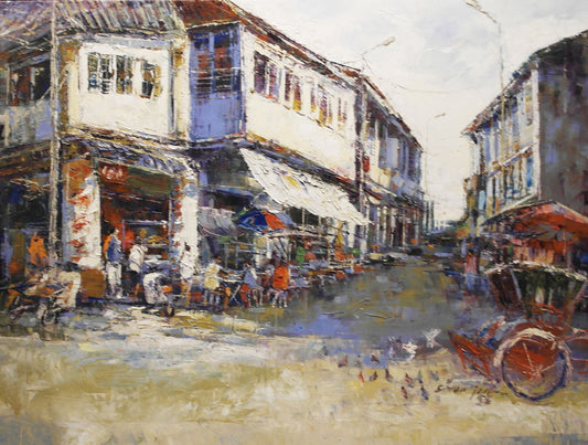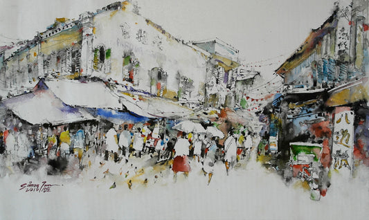 Simon Tan is an accomplished and outward-looking artist. He studied Chinese art and Chinese calligraphy painting before moving on to learn Western art. He loves to explore new techniques and fuses Eastern and Western sensibilities in art. Tans's paintings are infused with vigor and resonance. He has a restless urge to explore scenes that are visually appealing to him. He loves to paint directly on-site. He loves the old Chinatown. To him, Chinatown encapsulates history, culture, and daily existence. He captures the vibrant visual atmosphere in this painting. The brush works are very spontaneous and exuberant. The dashes of red depict a celebratory mood.