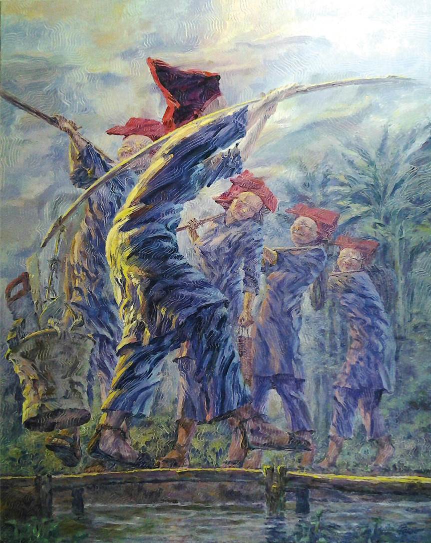 The samsui women toiled thousands of miles away from their homeland during the 1950s in search of construction and industrial jobs. Teo chooses to illustrate the iconic samsui women of early Singapore in a light-hearted style, while imbuing them with the values of sharing, comradeship, hard work and resilience. Their faces are seen smiling in every painting in spite of their back-breaking labour.