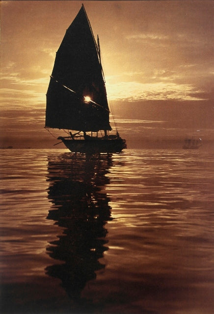 The Master Photographer, Yip Cheong-Fun was awarded the title, Outstanding Photographer of the Century by the Photographic Society of New York as the Century`s Seascape Specialist in 1980. He is known for his seascapes and has an unparalleled number of images capturing life by the sea and of course, the sea itself. Taken in totality, however, he demonstrates the same energy in his historical landscapes. This picture of a Chinese junk was taken off the coastal waters of Singapore in 1956. It is a colourful picture of a Chinese Junk in full sail in a sea with waves and ripples shimmering in matchless splendour. It shows the unique skills of Yip The visual effect is developed by the photographer using lights and shadows in different tones and textures, embellished with other details of lines, forms and silhouettes. The photographer`s sense of aesthetic form is felt by looking at the magnificence of the tall masts and stately sails of a vessel that dominated world trade a thousand years before the European nations have mastered the art of ocean voyaging. Chinese junks rumbled and snarled around fishing grounds and the coastal waters of many countries.